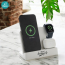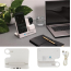 Constructed from recycled ABS material, this innovative product boasts a 15W wireless charger alongside an additional 5W wireless charger for smaller gadgets. Equipped with a designated slot for an iWatch and USB ports to accommodate various charging requirements, this stand also features silicone tips for enhanced grip and cushioning to cradle your phone securely.