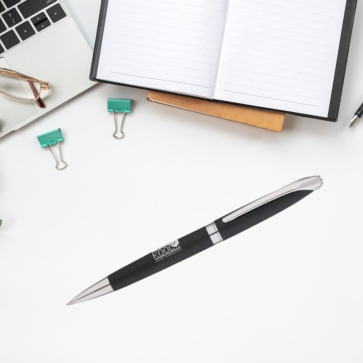 Style, elegance and a weighty feel in this prestigious twist action ball pen with a chrome undercoat for 'mirror' engraving. Can be supplied on its own or as a set with the matching roller pen.