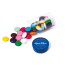 A mini tube filled with sugar coated chocolate beanies. Branded with a full colour paper label to the tube. A selection of colours are available for the lids – please contact us for more information.