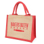 Coloured jute shopper made from 62% jute, 23% cotton and 15% polypropylene. Features include gusset, padded cotton webbed handles and laminated backing.