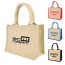 The mini jute bag with gusset, rope handles, jute trim and laminated backing. Available in natural, or with 3 striking trim colours.